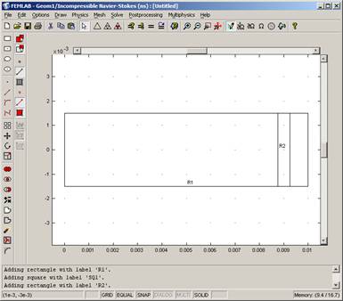 1.Запустите COMSOL Multiphysics. 1.1 В Навигаторе моделей на странице New выберите COMSOL Multiphysics>Fluid Dynamics>Incompressible Navier-Stokes> Transient analysis. 1.2 Щелкните OK. 2. Моделирование геометрии 2. Выберите (нажав клавишу Shift) кнопку инструмента Rectangle/Square на панели инструментов Draw. 2.1Установите параметры прямоугольника в соответствии со следующей таблицей. Таблица 1: