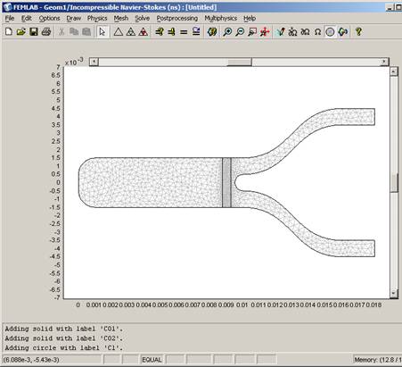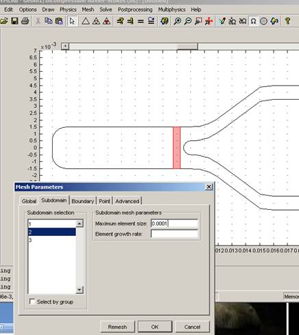 Рисунок 13 Установки для физической области 4.2 Из меню Physics откройте диалоговое окно Subdomain Settings. 4.3 Установите для density значение rho и для dynamic viscosity значение eta. 4.4Щелкните OK. 4.5 Генерирование сетки 4.6 Из меню Mesh откройте диалоговое окно Mesh Parameters. 4.7 На закладке General введите 0.0004 в поле Maximum element size, и значение 1.5 в поле Element growth rate. 4.8 Перейдите к закладке Subdomain. 4.9 Выделите подобласть 2 в списке Subdomain selection. Установите значение Maximum element size равным 0.0001.