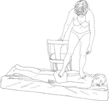 Рис. 66. «Прогулка по спине» Массажист встает ему на спину: одна стопа помещается на уровне лопаток, а другая — на ягодицах в районе копчика. Стопы располагайте поперек спины партнера. Попросите партнера свободно дышать. Когда он делает выдох, вам надо сместить вес своего тела на ту ногу, что стоит на лопатках, а когда вдыхает, смещаете его на область ягодиц, то есть плавно переносите на другую ногу. «Походите» таким образом по спине партнера в течение одной минуты. Осторожно, придерживаясь руками за стену или стул, переместитесь так, чтобы одна стопа стояла чуть выше лопаток, а вторая — чуть ниже. Теперь при выдохе ваш вес смещается в район плечевого пояса партнера, а при вдохе — вниз, под лопатки. Если вы не слишком тяжелы для партнера, встаньте обеими стопами в район плечевого пояса, поместив стопы поперек спины. Попросите его расслабиться и не бороться с тяжестью вашего тела. Как правило, в этом случае лежащий человек с удивлением обнаруживает, что, несмотря на тяжесть тела массажиста, ему очень легко дышать. Далее «прогуляйтесь» вниз по спине партнера, делая очень мелкие приставные шажки, в то время как партнер будет расслабляться и «отдаваться» вашему весу. «Прогулка» заканчивается на ягодицах партнера. Теперь встаньте обеими ногами на ягодицы партнера, повернувшись лицом к его голове. Придерживаясь за стену или стул, проимитируйте подпрыгивание, то есть попружинь-те ногами. Эта манипуляция помогает высвободить таз, а дыхание напарника станет еще глубже. • Осознавали ли вы партнера? • Расслабился ли он? • Чувствовали ли вы напряженные мышцы спины стопами? По мере приобретения опыта вы освоите этот вид массажа достаточно хорошо и обнаружите, что он требуется довольно часто. После того как вы освоили техники массажа, описанные в этой книге, можете распространить приемы массажа на другие области тела. К примеру, очень эффективным и приятным бывает массаж икроножных и бедренных мышц. Основной принцип массажа — сензитивность по отношению к партнеру. Чувствуйте его тело и ощущайте, какие движения помогут ему почувствовать себя лучше. Наиболее эффективен тот массаж, который приносит наибольшее удовольствие.