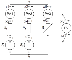 II Содержание и порядок выполнения работы Принципиальная схема исследуемой электрической цепи представлена на рисунке 2.1. Для сборки цепи используют источники постоянного напряжения из блока МОДУЛЬ ПИТАНИЯ: ЭДС