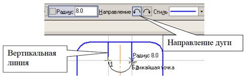 Командою Отрезок (основна лінія) обведіть вертикальні лінії, рис. 7. Дугу виконайте командою Дуга по двум точкам, (підведіть курсор до першої точки, потім до другої), рис. 7. При необхідності поміняйте напрямок дуги в рядку параметрів, рис. 7. Побудуйте другу дугу.