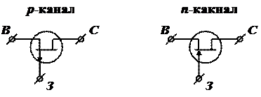 Слід відмітити, що визначення По типу провідності електродів транзистори бувають із затвором п- типу та р- типу і, відповідно, каналом р- типу та п- типу. Їхні схемні позначення показані на рис. 8.