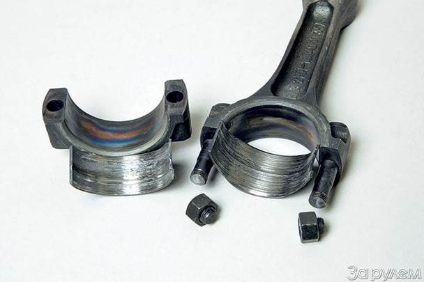 Ожидаемый результат сухого трения: коленвал и шатун - под замену... Как бы то ни было, первый результат эксперимента уже достигнут - серийный «жигулевский» двигатель без масла, вопреки общепринятому мнению и, признаюсь, к моему немалому удивлению, способен работать довольно долго, если, конечно, не требовать от него полной мощности. Поэтому, кстати, рекомендацию некоторых спецов заполнять масляный фильтр при его замене можно считать надуманной. Тем не менее уповать на нормальную работу двигателя без масла - с присадкой ли, без нее - не стоит. Хотя наш одолел 74 километра, это не значит, что любой другой повторит этот результат. Во-первых, двух абсолютно одинаковых моторов не бывает - поля допусков на размеры, твердость, чистоту обработки деталей могут сложиться как угодно, а во-вторых, многое зависит от нагрузки на мотор. Как знать, будь наша «пятерка» полностью загружена, а дорога - не столь легка, сколько бы продержалась? Нам же требовалась точка отсчета.