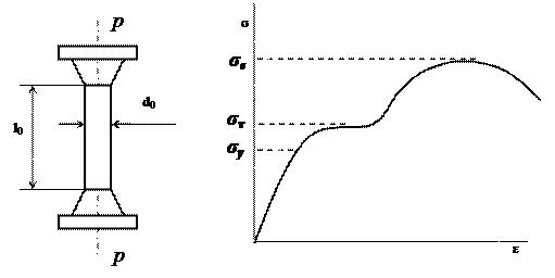 Испытания производятся на цилиндрических (или плоских) образцах с определенным соотношением между длиной l0 и диаметром d0. Образец растягивается под действием приложенной силы P (рис. 1.1.) до разрушения. Внешняя нагрузка вызывает в образце напряжение и деформацию. Напряжение σ – это отношение силы P к площади поперечного сечения F, МПа: