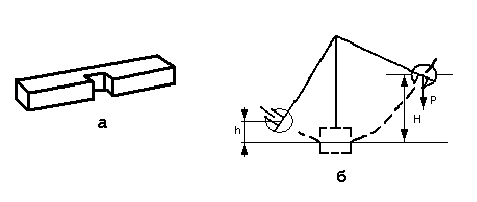 Определение ударной вязкости Для оценки вязкости материалов и установления их склонности к переходу из вязкого в хрупкое состояние проводят испытания при динамических нагрузках. Метод основан на разрушении образца с надрезом (рис. 3.3., а) посередине одним ударом маятникового копра (рис. 3.3, б).