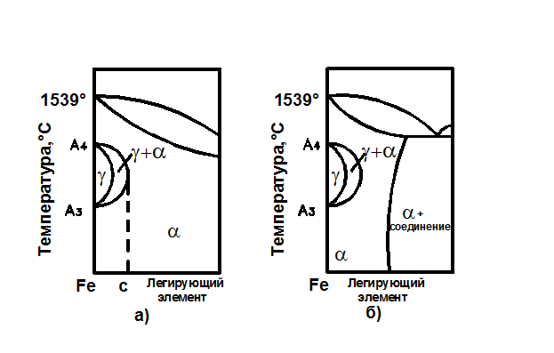Рис. 8.2 Схема диаграммы состояния “железо — легирующий элемент группы хрома” а) с замкнутой g-областью б) с промежуточной фазой