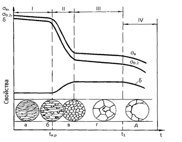 Рис. 14.3. Схема изменения свойств и структуры наклепанного металла при нагреве: I - возврат; П - первичная рекристаллизация; Ш - собирательная рекристаллизация; IV - вторичная рекристаллизация; а - наклепанный металл; б - начало первичной рекристаллизации; в - завершение первичной рекристаллизации; г - собирательн ая рекристаллизация; д - вторичная рекристаллизация д - вторичная рекристаллизация