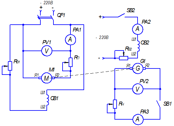 Лабораторная установка состоит из приводного двигателя постоянного тока параллельного возбуждения М1 и испытуемого генератора постоянного тока независимого возбуждения G1, автоматического выключателя QF1, проволочных реостатов RВ1, RВ2, предназначенных для изменения сопротивления в обмотках возбуждения двигателя постоянного тока М1 и генератора c независимым возбуждением G1, проволочного реостата RП, предназначенного для изменения сопротивления в обмотке якоря двигателя М1, жидкостного реостата RН, выступающего в качестве нагрузки генератора G1, амперметров PA1, PA2 и PA3, вольтметров PV1 и PV2, однополюсных ключей SB1 и SB2. Схема лабораторной установки представлена на рисунке 4.1.
