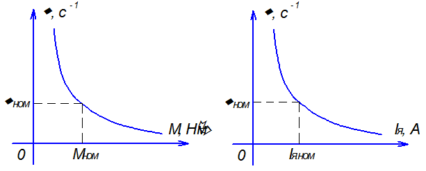 Следовательно, механическая и электромеханическая характеристики w = = f(M) и w = f(I) имеют гиперболический характер, как показано на рисунке 3.2. Так как при IЯ > IН на работу двигателя начинает влиять насыщение, характеристики становятся более жесткими.