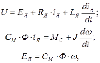 где RЯ и LЯ - сопротивление и индуктивность обмотки якоря; Ф, J и МС - магнитный поток, момент инерции и момент сопротивления; СМ - конструктивная постоянная машины.