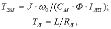 При этом принято, что обмотка возбуждения подключена к питающей сети и магнитный поток является постоянным (Ф=const), сеть считается достаточно мощной (U=const), пуск производится при постоянном статическом моменте (Мс=const). В двигателях малой мощности максимальное значение тока допускает прямой пуск. В двигателях большой мощности электромеханическая постоянная времени ТЭМ во много раз больше электромагнитной постоянной ТЯ, находимые по формулам: