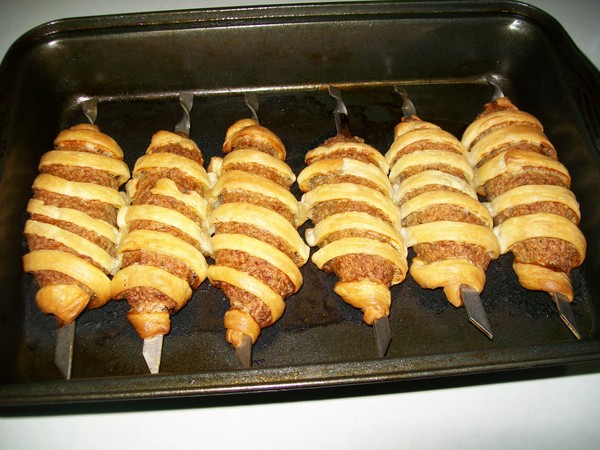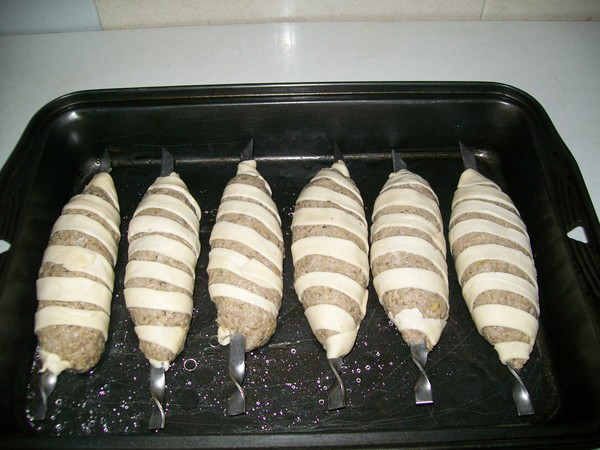 Слоёное тесто раскатать толщиной в 1мм.,порезать на полосочки произвольной ширины.И, начиная с кончика с(лёгкой!)натяжкой обернуть люля с произвольным наклоном.