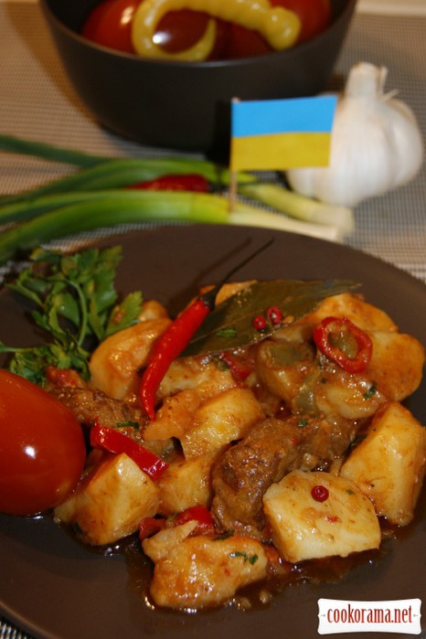 дополнительные ингредиенты для жаркого: 1. 1 кг картофеля почистить и нарезать кусочками 2х2 см 2. 40 гр сливочного масла 3. 250 мл овощного или мясного бульона