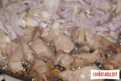 Способ приготовления: Хорошо нагреть масло и быстро обжарить в нём мясо до румяной корочки. добавить лук и чеснок, тушить 3-4 минуты.