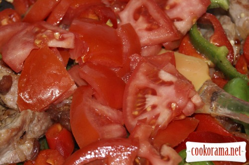 Добавить перец и томаты, тушить 5-7 минут.