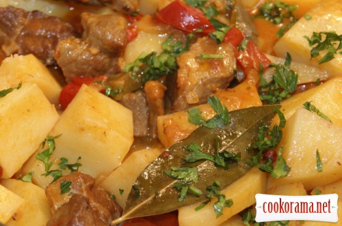 Накрыть крышкой убавить огонь и тушить в собственном соку минут 15. Снять крышку, посолить и поперчить, добавить огонь и тушить до испарения жидкости наполовину. Разделить готовое мясо на 2 части. Поместить половину мяса в кастрюльку, влить 1 стакан овощного или мясного бульона, дать ему закипеть и добавить картофель, довести до кипения, при необходимости добавить соль. Убрать огонь, добавить масло и лавровый лист.