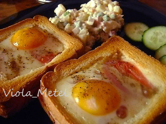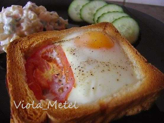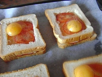 • тоненькие кусочки ветчины или копченое мясо; Помидоры нарезать дольками. У 4 кусков хлеба убрать мякиш. Целые выложить на противень, на них ветчину, сверху ободки хлеба без мякиша. В дырочки выложить помидорки и залить яйцом. Посолить поперчить и в духовку - запекать на 180 градусов - 20-25 минут. И оригинальный завтрак готов!) Приятного Аппетита!!!