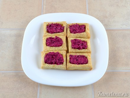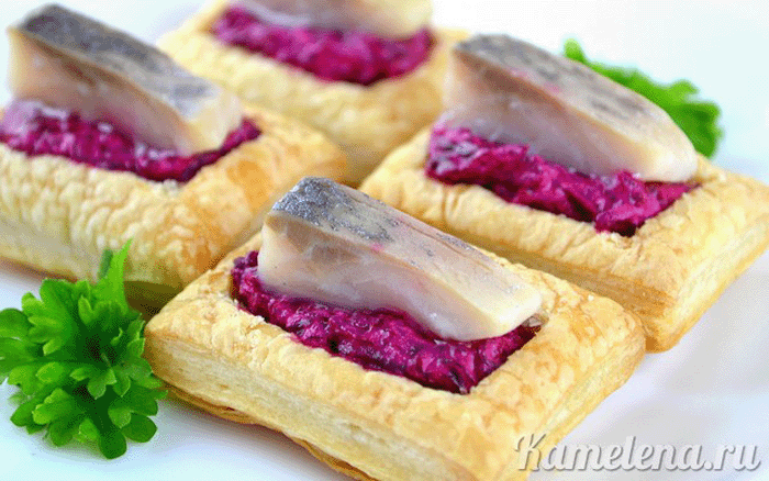 СЛОЙКИ СО СВЕКОЛЬНОЙ НАЧИНКОЙ И СЕЛЁДКОЙ Эти маленькие слоечки будут прекрасной закуской праздничного стола, кроме того, их можно приготовить и в будни, например как, интересное дополнение к завтраку. Сочетание селедки и свеклы придает слойке неординарный вкус, а сметана добавляет нежности. Оригинальный внешний вид, притягивает взгляды и вызывает желание попробовать это блюдо. Приготовить такие слойки совсем не трудно, да и времени на готовку Вы потратите немного.