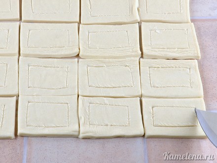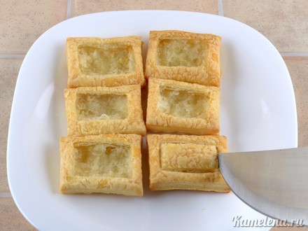Приготовление: Тесто разморозить, раскатывать не нужно. При желании можно сделать слойки бóльшего размера. Слойки можно начинить различными начинками, например, печеночным паштетом, творожной массой, а можно и сладким заварным кремом. У меня получилось 30 штук слоек.