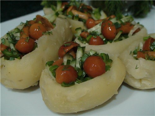 Картофель варим или печем в мундире,(я это сделала в микроволновке) чистим и ложкой делаем углубление и присолить. Начинка: опята маринованные, свежий огурец, (меленькой соломкой) зеленый лук,зелень, р. масло - всё перемешать и этой массой фаршируем картофель.