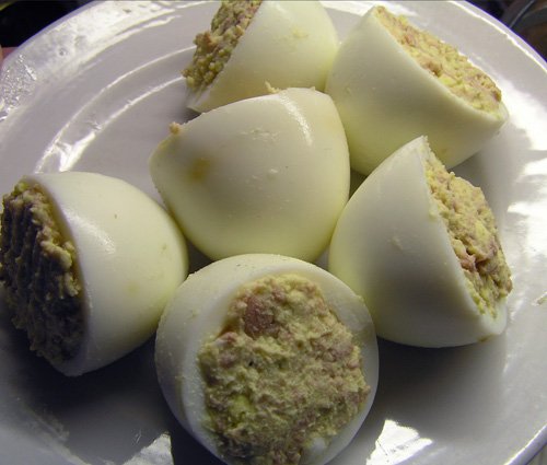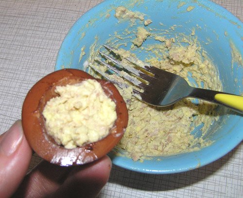 Затем фаршируем наши "ножки". Если от желтка осталось маленькое отверствие, то можно аккуратно ножом увеличить его.