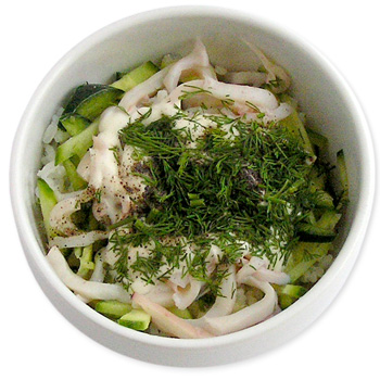 Дивайн Незабываемый, романтичный вкус. Кальмар, яйцо, огурец, рис, лук, майонез