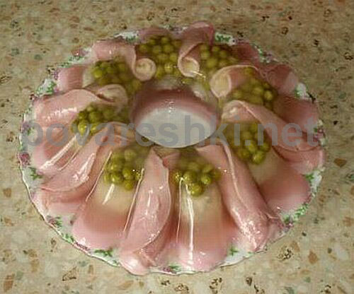 Сверните рулетики, уложите в форму через грань. Украсьте зеленым горошком, морковкой, петрушкой.