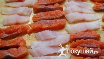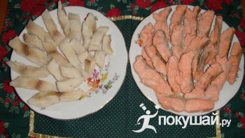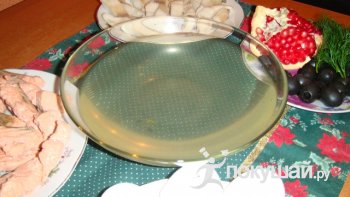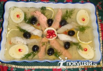 Филе красной и белой рыбы нарезается прямоугольниками и варится в отдельной посуде (красная в одной кастрюле, белая в другой). После закипания варить - 10-12 если рыба была замороженная и не менее 15 минут если рыба свежая. В бульон добавляется соль, перец, лавровый лист. Рыбу выкладываем на блюда, даем ей остыть. Бульон не выливаем. Гранат очищаем. Маслины достаем из банки. Варенные яйца разрезаем вдоль на 3-4 части. Лимон нарезаем дольками. Если ваш бульон получился прозрачным туда вы добавляете желатин, следуя инструкциям напечатанной на пачке. Если вкус вашего бульона вам не нравится, вы берете кипяченую воду и добавляете туда приправу для заливного. Или же если вам не хватило бульона, можно воспользоваться вторым вариантом. На блюдо вы выкладываете все подготовленные ингредиенты и составляете композицию которая будет радовать ваш глаз. Очень аккуратно, чтобы не сдвинуть ингредиенты, малыми дозами вливается охлажденный бульон с желатином. Можно фантазировать и добавлять в заливное те продукты, которые вы любите. В данном случае добавлена отварная морковь в виде ёлочек. Так же аккуратно заливаем бульоном.