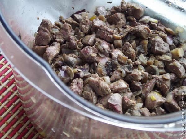 Готовую смесь из печени, лука и грибов выкладываем в емкость для остывания.