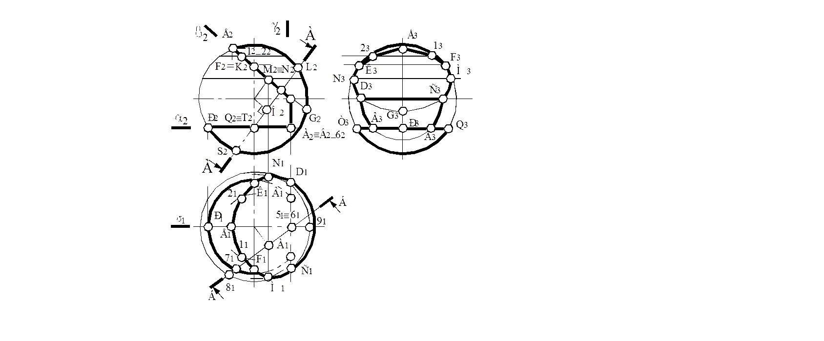 Решение: 1. Определяем А,В,С и D рёбер призматического выреза. 2. Определяем опорные точки E, G, M, N, F и К сечения сферы плоскостью β, затем промежуточные точки 1,2,3 и 4. 3. Определяем опорные точки P,Q и Т сечения сферы плоскостью α. 4. Строим горизонтальные и профильные проекции фигур сечения поверхности шара заданными плоскостями. 5. Строим натуральную величину сечения А-А шара с учётом призматического выреза в нём. 6. Строим натуральную величину сечения Б-Б. 7. Выполняем окончательное оформление чертежа.