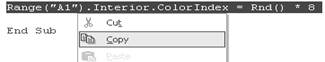 3.5. Объявите начало процедуры ключевым словом Sub. Через пробел введите название процедуры Узор (), где скобки предполагаю возможные входные переменные (аргументы). 3.6. Нажмите Ввод. Курсор перешел на следующую строку, но автоматически снизу появилось ключевое словосочетание, которое заканчивает любую процедуру: End Sub. 3.7. Наберите первую строку тела процедуры, начиная с указания объекта Range(“A1”), т.е. ячейка с адресом А1. 3.8. 3.9. Снова нажмите точку и выберите свойство ColorIndex предыдущего свойства, которое одновременно само является объектом. 3.10. Присвойте последнему свойству значение с помощью функции Rnd(), т.е. генерация произвольного числа от 0 до 1. 3.11. 3.12. 3.13.