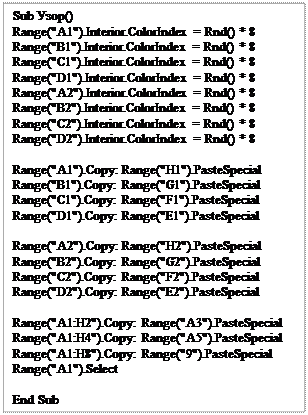 3.14. Продолжите работу самостоятельно, учитывая, что первый блок меняет случайным образом цвет номерами 0-8 в ячейках в диапазоне А1:D2. 3.15. Во втором блоке с помощью метода (т.е. стандартной команды действия) с названием. Copy происходит поочередное копирование в буфер обмена 4 клетки в первом ряду. С помощью метода. PasteSpecial происходит вставка в соответствующие адресам клетки. 3.16. Самостоятельно разберитесь с третьим и четвертым блоками, запоминая, что метод. Select – это выделение указанного диапазона ячеек. Date: 2015-07-24; view: 453; Нарушение авторских прав |