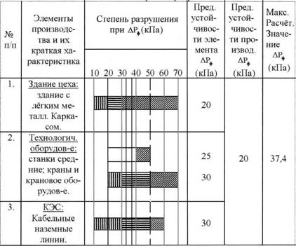 Таблица 1. Результаты оценки устойчивости авторемонтной мастерской к воздействию с воздушной ударной волны.