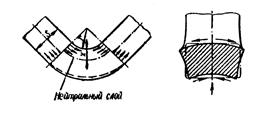 Гибка труб производится на гибочных приспособлениях между двумя роликами или на специальных трубогибочных машинах с неподвижной оправкой ложкообразной формы, или в штампах. В последнем типе гибка трубки в кольцо производится в три приёма. Вначале подгибается по радиусу один конец, потом второй, а затем производится полный изгиб кольца. Гибка тонкостенных профилей осуществляется на специальных профилегибочных или растяжных станках. Существует два типа профилегибочных растяжных станков: с поворотным столом и неподвижным столом и подвижными зажимами. В табл.16 значение коэффициента х в каждом случае своё, которое зависит от отношения радиуса гиба от толщины детали.Таким же образом определяется икоэффициент у. Длина нейтрального слоя определяется по формуле
