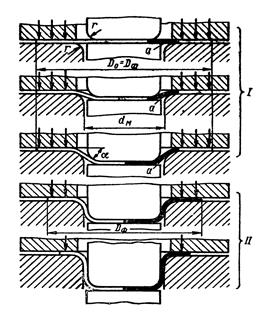 Рисунок 5 - Последовательность процесса глубокой вытяжки с прижимом заготовки