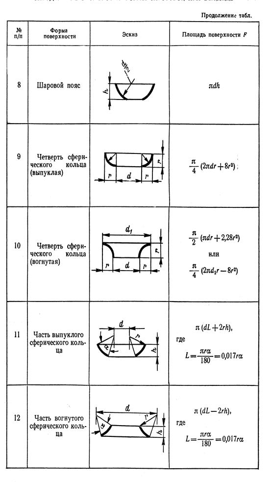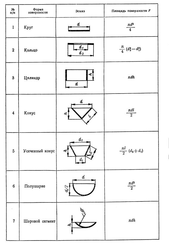 Таблица 5 - Площади поверхности простых геометрических форм
