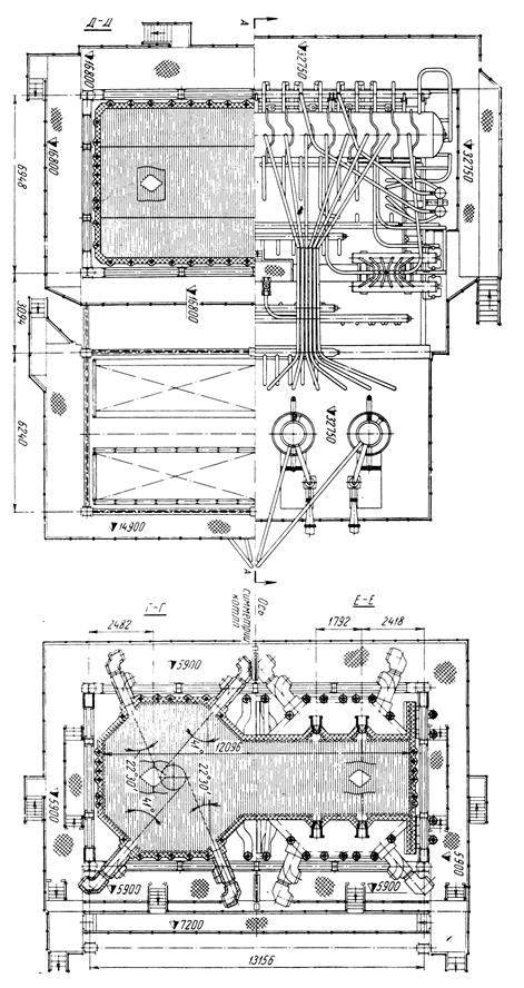 3.2.1. Топка. Котёл имеет однокамерную топку полуоткрытого типа. Фронтальный и задний экраны на отметке 11380 мм образуют пережим, которым топка делится две камеры – камеру горения и камеру охлаждения. Сечение топочной камеры в пережиме по осям труб 12096х2944 мм. Камера горения выполнена в виде двух сообщающихся восьмигранных предтопков, каждый из которых оборудован восемью горелками, расположенными в два яруса по тангенциальной схеме. Трубы фронтового, боковых и заднего экранов в своей нижней части образуют слабонаклонный под, в котором выполнены две летки, предназначенные для удаления шлака. Для лучшей организации процесса горения трубы, образующие камеру горения ошипованы и покрыты пластичной хромитовой массой. Камера охлаждения в плане имеет прямоугольную форму с размерами по осям труб 12096х5888мм. Потолок топки и поворотного газохода экранированы трубами потолочной части первой ступени пароперегревателя. 3.2.2. Горелочные устройства. Четыре прямоточные основные горелки расположены по углам каждого предтопка так, что их оси направлены к воображаемой окружности диаметром 980 мм и наклонены к горизонтали под углом 150. Сбросные горелки расположены над основными и создают в центре топки вихрь с противоположным направлением вращения. Для растопки каждый котёл оборудован двумя муфельными горелками, расположенными с боков камеры горения на отм.7 м.