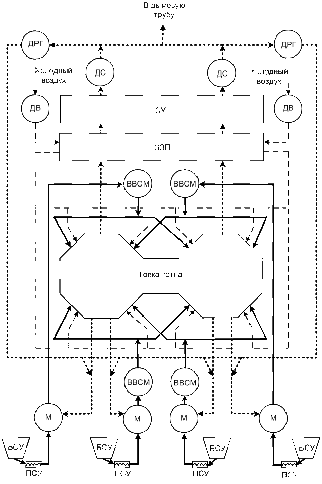После мельницы аэросмесь поступает в инерционный сепаратор, где из потока отделяются крупные частицы пыли и возвращаются в мельницу. Далее аэросмесь поступает в мельничный вентилятор ВВСМ–ЗУ (вентилятор валковых среднеходных мельниц), затем в пылеконцентратор, где происходит разделение пыли и сушильного агента. Пыль из пылеконцентратора направляется в основную горелку, а запыленный сушильный агент – в сбросную. Таким образом, отсос дымовых газов на сушку и транспорт пыли от мельницы до горелок осуществляется мельничными вентиляторами ВВСМ-ЗУ. Тягодутьевая установка состоит из дутьевых вентиляторов типа ВДН-18Пу (2 шт.) и дымососов типа Д-21,5×2 (2 шт.). Характеристика вспомогательного оборудования котла представлена в таблице 4.