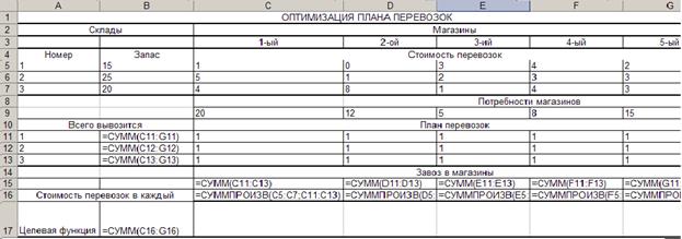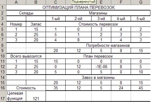 3. Для запуска режима Поиск решения щелкнуть по кнопке Выполнить В результате улучшения плана получим оптимальный план стоимости перевозок с ЦФ С=121 (рис.3)
