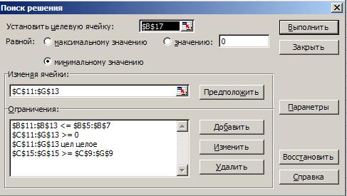 2. Введём данные: Установить целевую ячейку В17 Равной минимальному значению Изменяя ячейки С11:G13 ограничения С11:G13>=0 C11:G13=целые В11:В13≤B5:B7 (ограничение по предложению) С15:G15≥C9:G9 (ограничение по спросу)