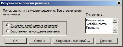 Как видно из рис. 4, сформированную систему ограничений в дальнейшем можно редактировать. Для этого служат кнопки «Изменить» и «Удалить». Нажать кнопку «Выполнить», после чего будет проведена процедура поиска решения. О результате поиска можно узнать из сообщения о найденном решении или о невозможности его обнаружить (рис. 5). Как видно из рисунка, полученные результаты можно сохранить, нажав на кнопку ОК, изменив таким образом, содержимое ячеек с переменными. Можно отказаться и не сохранять полученное решение. Кроме того, можно сформировать отчет с более подробной информацией о том, как происходил процесс поиска решения. Для этого служит кнопка «Сохранить сценарий»