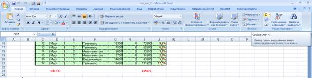 Чаще всего используется для подведения итогов по строке или столбцу. В нашем примере с помощью этой функции считается ИТОГО. После первого щелчкавиден д иапазон суммируемых ячеек. При необходимости его можно скорректировать и затем щелкнуть повторно. Date: 2015-07-22; view: 438; Нарушение авторских прав |
