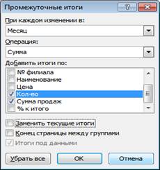 · При подведении вложенных итогов (в данном примере – по месяцу) следует повторно обратиться к той же команде Вкладка Формулы, группа Структура, Промежуточные итоги. В При каждом изменении в выбрать месяц. Но привложенных итогах следует сбросить флажок Заменить текущие итоги. Чтобы удалить итоги, в том же окне кнопка Убрать всё Date: 2015-07-22; view: 363; Нарушение авторских прав |