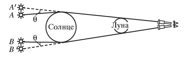 Искривление луча света вблизи массивного тела[14] Диск Солнца загораживает звезды, находящиеся в точках А и В. Однако свет от этих звезд проходит мимо Солнца, и оно, согласно общей теории относительности, искривляет лучи света таким образом, что они попадают в глаза наблюдателя. Картина получается такой, как если бы звезды находились в точках А' и В', а Солнце бы отсутствовало. 2. Вблизи массивных тел время замедляется. Во Вселенной существуют массивные космические объекты, вблизи которых эффект замедления времени весьма существенный. Согласно общей теории относительности, нейтронные звезды замедляют течение времени на величину порядка 10%, а в «черных дырах» оно практически останавливается. 3. При прохождении света вблизи массивных тел происходит смещение спектральных линий в сторону красного конца спектра. Если направить луч белого света на стеклянную треугольную призму, он разлагается в спектр – набор цветных пятен, плавно переходящих от одного к другому. Этот опыт в 1666 году поставил Исаак Ньютон. Такую же игру цвета представляет собой радуга. Каждому цвету соответствует определенная длина волны. Самые длинные волны из видимого спектра – красные, самые короткие ‒ фиолетовые. Каждый химический элемент испускает свой характерный спектр, который представляет собой чередующиеся линии на фоне радуги. По спектральным линиям можно определять химический состав нагретого тела, которое испускает лучи света. Общая теория относительности предсказала эффект «гравитационного красного смещения» ‒ смещения спектральных линий в сторону красного конца спектра при прохождении света вблизи массивных тел. (См. цветную иллюстрацию I). Физики создали около тридцати теорий гравитации. Особенность общей теории относительности заключается в том, что она объясняет это явление не как результат действия гравитационного поля, а как искривление пространства. Пояснить это можно с помощью следующего рассуждения.