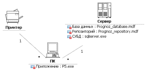 Пример диаграммы размещения представлен на рисунке (см. Рисунок 24). Постройте диаграмму размещения для вашей информационной системы. Для этого выполните следующие шаги: - Определите перечень всех аппаратных, механических и других типов устройств, которые необходимы для выполнения системой всех своих функций. - Разместите все исполняемые компоненты диаграммы (см. лабораторную работу №25) по узлам системы. - Установите соединения узлов.