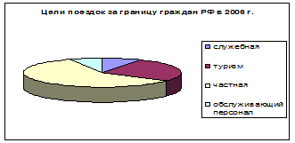 Круговые диаграммы представляют значения показателя в виде занимаемой им площади в общем объеме. Например, цели посещения иностранных граждан Российской Федерации в 2008 г. (рис.3)