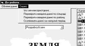 - з’явиться повідомлення з пропозицією переписати звіт, натиснути кнопку „ТАК”, інформація буде поновлена. 4.13 Підготовка програми до роботи в поточному році Коли всі недоліки виявлені і вправлені, звіт прийнято – треба підготувати систему для роботи в поточному році: · на панелі „РІВЕНЬ” вибрати наступне півріччя (місяць, рік); · на головній панелі „ДО РОБОТИ” в меню „Сервіс” вибрати команду „СКОПІЮВАТИ ДАНІ ЗА МИНУЛИЙ ПЕРІОД”. Після цього система готова до подальшої роботи.
