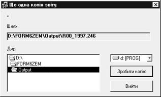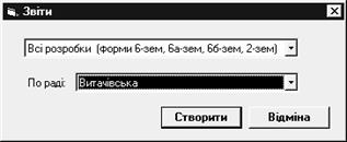 є) натиснути кнопку „ЗРОБИТИ КОПІЮ”; в результаті на флеш пам'ять буде скопійовано файл-звіт для здачі в обласне управління земельних ресурсів. 4.11 Формування та експорт звітів на паперовий носій: а) натиснути кнопку „ЗВІТИ” на головній панелі, з’явиться вікно „ЗВІТИ”; б) в рядку „ВСІ РОЗРОБКИ” вибрати звіт, який треба створити (форми 6-зем, 6а-зем, 6б-зем, 2-зем);