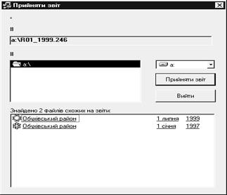 в) в рядку „ПО РАДІ” вибрати, по якій сільській (селищній, міській) раді треба створити звіт; г) натиснути кнопку „СТВОРИТИ”; д) з’явиться панель „ЗВІТ ПО РОЗРОБЦІ ФОРМИ 6-ЗЕМ КОНВЕРТУЄТЬСЯ B EXCEL”, відбудеться перерахування даних з наступною конвертацією в файл формату Microsoft Excel. Для цього потрібен деякий час. е) по закінченні конвертації з’явиться панель „ВІТАЄМО” із повідомленням, що в каталозі програми створена папка „Reports”, куди записується файл-звіт, який має назву, наприклад, „rox6_805.xls\report6.xls”. Звіти можна друкувати із Microsoft Excel на принтері. 4.12 Імпорт звітів Якщо після того, як звіт був зданий, в ньому на рівні обласного головного управління земельних ресурсів були виявлені і виправлені недоліки, в районний відділ повертається виправлений файл-звіт, який необхідно внести до бази даних. Для цього треба: - вставити дискету з виправленим файл-звітом в дисковод А; - вибрати меню „ОБМІННІ ДАНІ” команду „ПРИЙНЯТИ ОБМІННИЙ ФАЙЛ”; -