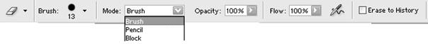 Инструмент Eraser(Ластик) В раскрывающемся списке Mode представлены 3 вида ластика: Brush, Pencil, и Block. При выборе одной из форм работа осуществляется соответствующим инструментом, но не основным, а фоновым цветом. При выборе варианта "Блок" происходит полное стирание изображения; Инструмент Background Eraser Инструмент Magic Eraser Date: 2015-07-24; view: 443; Нарушение авторских прав |